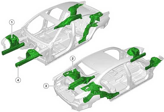 虽然同为CLAR平台,不同级别的车型车架材质也有明显的差异, G30 5系则由于成本原因没有采用CFRP材质,使用了钢铝混合车身设计,上图G30 5系的白车身中粉色部分为钢制材质,绿色部分为铝合金材质,在保证乘员舱高刚性的同时,降低车头和车尾溃缩区的重量。而到了G20 3系上,白车身设计则几乎看不到大面积的铝合金构件了。