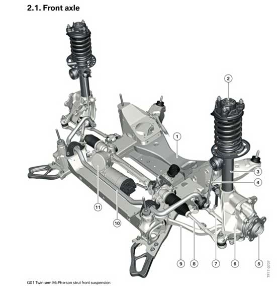 事实上G20 3系,G29 Z4,G01 X3/G02 X4等车型,前悬架结构采用宝马经典的双球节弹簧减振支柱结构,是麦弗逊悬架的一种变种,后悬架则采用五连杆结构,后悬架的副车架和控制臂也均为钢制材料。