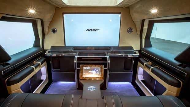 原来USSV的想法是想将这辆车打造成一款豪华SUV。可以看到,车内豪华堪比星级酒店。车内空间很大,座椅什么的都用真皮包裹。最夸张的地方就是装上了一台40英寸的液晶电视机,车内的娱乐功能比较多,同时还兼具商务会谈的功能。