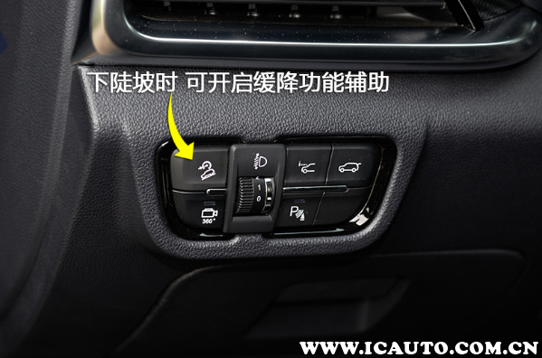 陡坡缓降功能可以使驾驶员能在不踩制动踏板的完全控制情况下,平稳的通过陡峭的下坡坡段。根据需要,制动装置自动控制各车轮,以略快于行走速度向前移动,此时驾驶员可完全专注于控制方向盘。