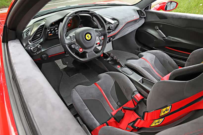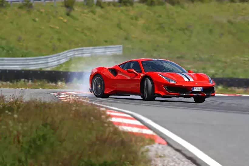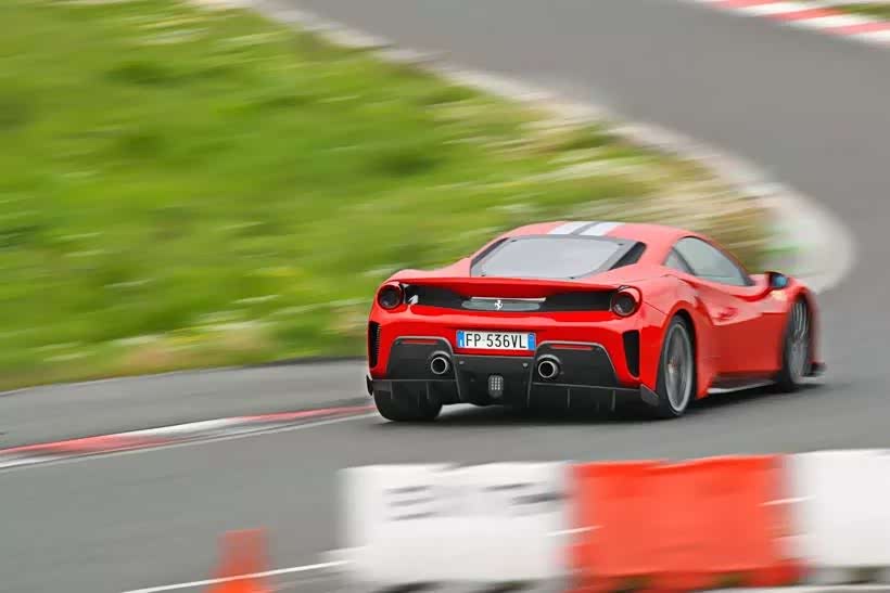Pista的测试结果令我们瞠目结舌:2.8秒破百,7.8秒后升至200公里/小时——相比于488 GTB,这一加速时间缩短了1.1秒。接下来,我们再来谈谈制动系统。在佩戴好四点安全带的情况下,行驶在乡间公路上,车外的行人或许会以为这位法拉利车主穿的是一件带领子的粉红色Polo衫,但当看到制动测试数据后,你就会意识到,这样的装备必不可少:法拉利Pista仅需29.5米便可完成初始速度为100公里/小时的制动过程。
