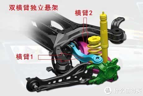 注:双横臂可以简单理解为简化版的双叉臂,将双叉的复杂形状改成两根简单的横臂,往往会搭配侧向拉杆加以辅助。制造成本也比双叉臂要低,更多的应用在后轮上。