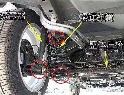 而对于扭力梁悬架,异响和震动往往来源于上图的三个部位,弹簧的上下顶胶和减震支柱的连接处。