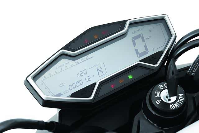 就外观来说,明显可以看出400NK与同平台650NK的整体设计是一脉相承的,车身线条流畅,上翘的车尾设计,也很有运动感。机械变形式的前脸设计,搭配黑色的车身配色,给人成熟稳重之感。