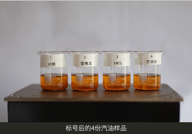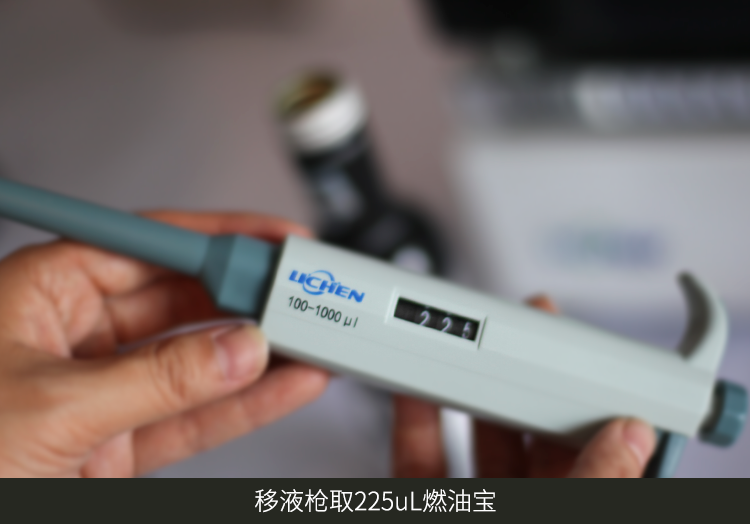 接下来到了最关键的一步,按照比例添加3款燃油宝,用精度为100-1000uL的移液枪分别取等比例的燃油宝分别加入到3个烧杯中,并重新打签贴到对应的烧杯上;