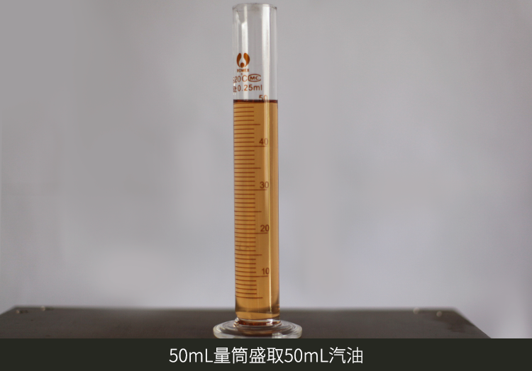 好了,4瓶积碳制作好了,因为第一次做烧杯实验,所以制作好的积碳样品还不够成熟,可能有的朋友会问,明明测试3款产品,为什么要制作4份积碳样品,因为还有一个作为对照。接下来,用量筒盛取50ml汽油,分别加入到每个积碳样本中;