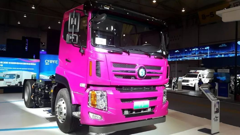 这款车出自于中电骏途,命名为图灵t1,听上去就颇具科技感,因为图灵本人是计算机的发明者。这款车只看车头的话,其实和普通的燃油版本半挂车相差不大,都采用了平头设计。不过这台车的颜色非常罕见,展示车型竟然采用了桃红色涂装,这样的大卡车走在路上应该会拥有不错的回头率。