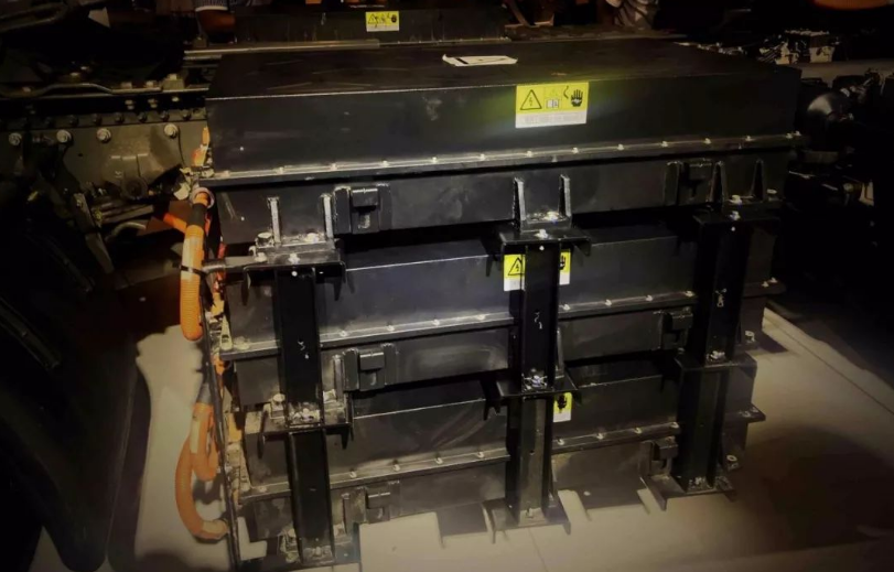 走到车身侧面就可以发现这款车的不同之处,巨大的电池组就挂在车外,可以看到电池组分为三层,而且中间有比较大的缝隙,这是为了给电池组降温。整套电池组采用磷酸铁锂电池技术,不过因为需要拉动的是一台满载质量43吨的大家伙,所以整个电池组的续航能力并没有那么强大,满电续航也只有120公里左右。