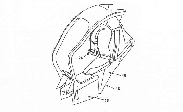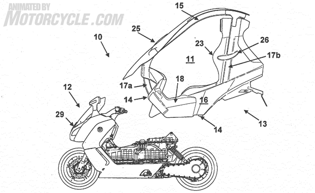 这次BMW似乎想要在电动车款C EVOLUTION上头再现C1的风采,这项专利透过C EVOLUTION的一体式车架设计,将车架与车身拆为两块模块,上半部的车身模块透过车厢坐垫、骨架、顶篷以及前挡风玻璃等部位的结合,整合成为一块模块,来与下半部的车架模块相结合。