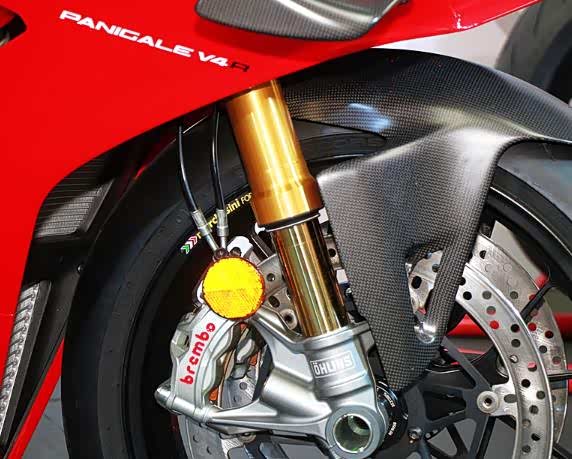 据厂方表示,全新直径43mm的Ohlins NPX 25/30倒立前叉专为V4 R而设,主要技术移植自DUCATI WSBK车队的科技。新前叉比起用于V4的Ohlins NIX3可减低发生"气穴"机会,避免气泡影响吸震性能,当车辆辗过凸凹路面及有更佳的急煞稳定性能,重量亦较Ohlins NIX3轻600g。