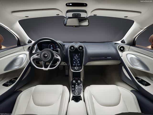 迈凯伦GT拥有迈凯伦经典的设计姿态,俯冲式线条由前向后延伸,水平穿过轮眉将视线吸引到车身的两侧,消失在巨大的进气口中。向后的车顶轮廓与轮眉相聚于集成式的固定尾翼,尾部巨大的扩散器和突出的排气尾管提醒人们,这是一款具有超级跑车性能的大型GT。