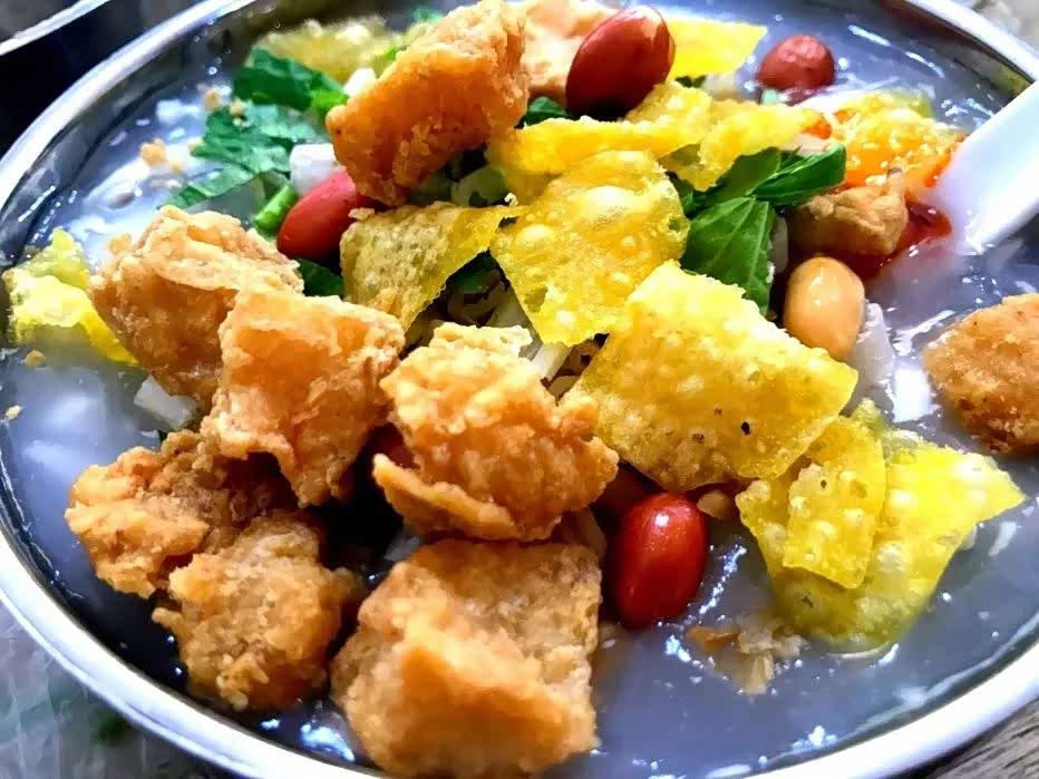 别着急出发,还有一件重要的事情。朱老师不知道在哪里看了一段旅游视频,被里面的乐山豆腐脑馋的发疯,于是一大早我们找到附近一家九九豆腐脑分店。本来我对豆腐脑没什么兴趣,但乐山的豆腐脑居然还用芡加热滚烫,再加牛肉、酥肉或者鸡丝。我要了一碗酥肉豆腐脑,朋!友!们!不夸张,真的好吃到爆炸了。滚烫的豆腐脑配上炸的金黄酥脆的酥肉,各种花生米和麻叶碎,简直了。我和朱老师都吃了两碗,而且后来再次住乐山时早餐依然是它,炒鸡推荐,大佛可以不看、峨眉山可以不登,乐山豆腐脑不能不吃。