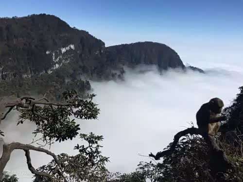 门票其实就是身份证,两天内峨眉山所有景区随便进出,乘坐景区大巴大约又快一个小时才到了雷洞坪停车场,一路上海拔上升的很快,早上还乌云满天,这时候蓝天白云,眼看着峨眉山市区已经在很远的脚下,自己朝着云端继续前进。雷洞坪到金顶还要爬山,偶在山坳看见云海,心情大好。