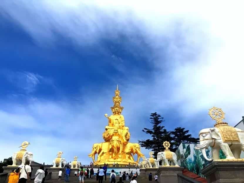 在脚下已经实在累的不想再走的时候,看见了缆车站,真的是救星,只不过像重庆过江索道一样的大型缆车一车坐下近百人真的挺要命的。登上金顶,不得不感叹我们的运气不错,像山下眺望,真是一览众山小,所有的白云都漂浮在脚下,随着一阵阵风吹过,脚下的云彩也在飘动。我走过山时,山不说话,我路过海时,海不说话,小毛驴滴滴答答,倚天剑伴我走天涯。大家都说我因为爱着杨过大侠,才在峨嵋山上出了家,其实我只是爱上了峨嵋山上的云和霞,像极了十六岁那年的烟花。不知道当年的为情所困的小郭襄是不是也常常站在这里对着云海想杨过。