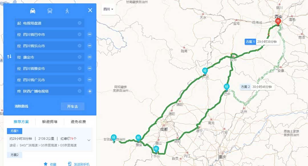 行程:陕西西安—四川巴中—四川乐山(峨眉山、犍为县)—四川康定—四川雅安—四川广元—陕西西安;全程2565km,用时8天,高速占比90%。