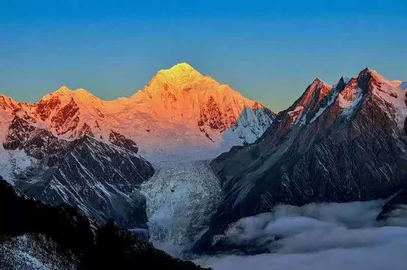 今天的目的地是海螺沟,这里可以看到著名的蜀山之王——贡嘎山,周围有海拔6000米以上的山峰45座,主峰更耸立于群峰之巅,海拔7556米,高出其东侧大渡河6000米,是四川省最高的山峰,山顶终年积雪,据说天气好的时候,在成都都能看到。