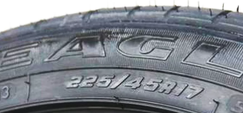 轮胎上最重要的一组标号就是代表了轮胎的尺寸和类型,比如常见的225/45/R17的轮胎。
