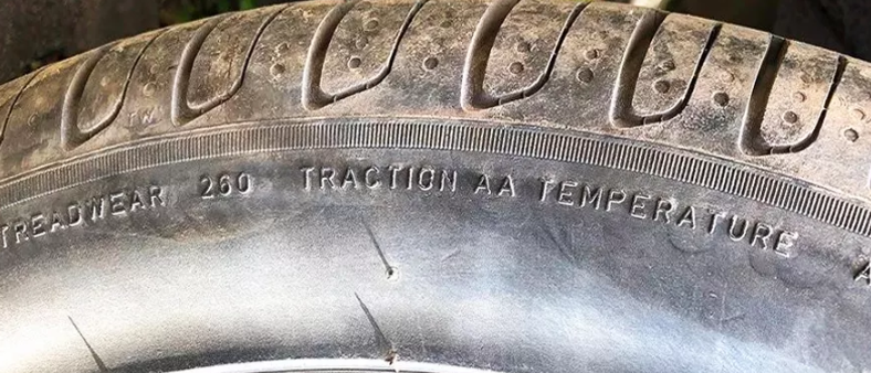 那么除了刚才那些最常见的这串数字,轮胎的侧壁上面一般还有3个T开头的英文字母,排成这么一排的。这就是轮胎的3T等级,它分别是TREADWEAR耐磨指数、TRACTION牵引力等级和TEMPERATURE温度等级。