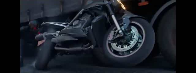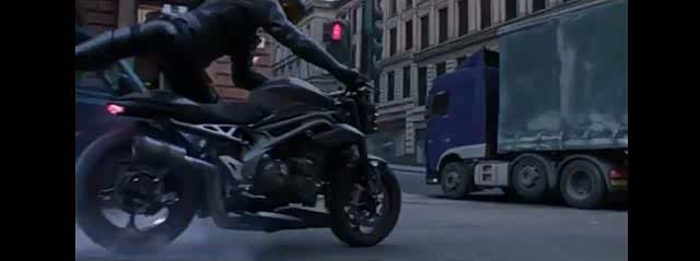 这次电影中反派人物最吸引眼球的就是可以变形和自动驾驶的摩托,毕竟是一件号称要“拯救世界”的科技公司。这台怪异的摩托,与同样怪异的凯旋,可谓不谋而合。凯旋是英国汽车品牌,一向坚持三缸发动机,而这台Triumph Speed Tribe原型车拥有150马力和117Nm,配备顶级Ohlins避震,操控不言而喻,电影中的它也是飞天遁地无所不能。