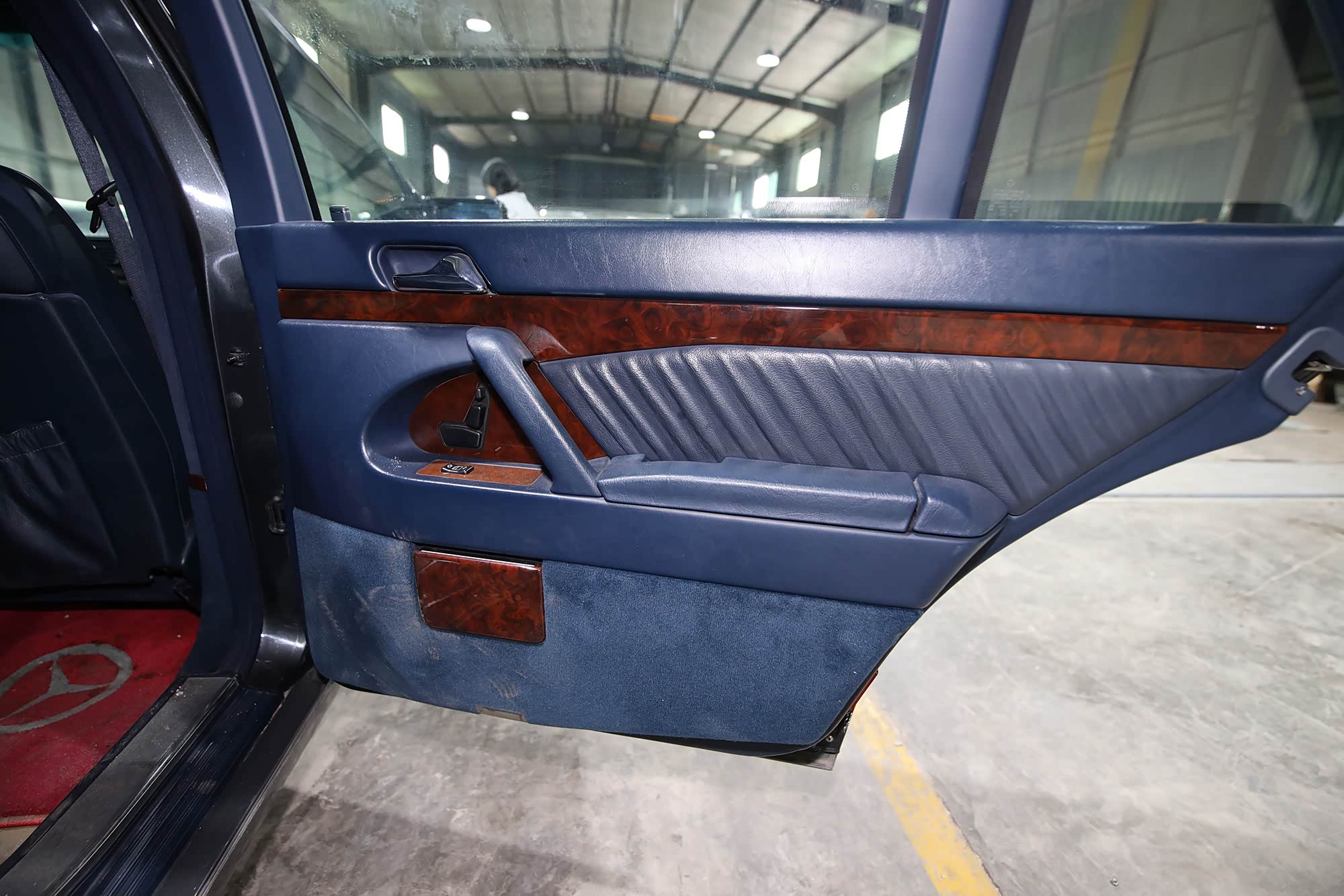 后车门十分狭长,可以看到奔驰经典的座椅型座椅电动调节那个时候就在用了。门上除了真皮,同样镶嵌了大面积的桃木。而在车门下侧,则是使用了跟羊毛毯一样的绒绒的材质,有知道具体材质的吗?