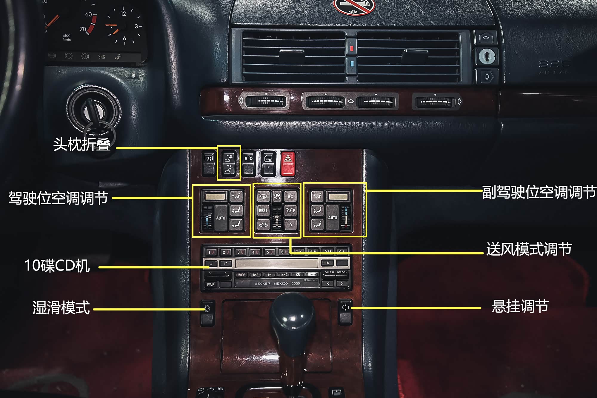 中控台的各种功能单元我梳理了一下,这样大家看着更直观。在大面积红色桃木面板的映衬下,中控台显得很有艺术感。功能虽多,但以现在的眼光和配置看,已经很寒酸了,好好想想看如今的S级所拥有的功能和配置,才会发现科技的进步实在是太大了。