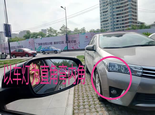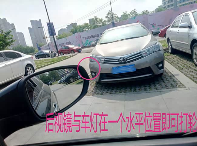 大家可以看下图,当你看到右后视镜,几乎与内角(画圈的车灯)在一个水平位置时,这就是打轮的时机。