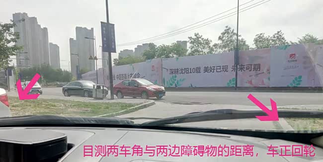 当车正的时候,把方向回正即可,因为下图中左、右两边还有障碍,这个时候,驾驶员还要留意一下,两个车角与两边障碍的间距。