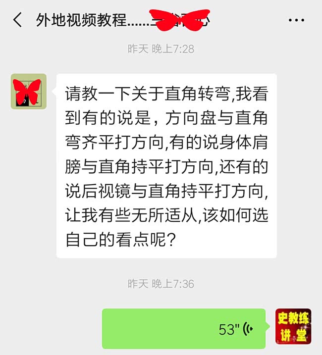 下图就是史教练的一位外地远程指导学员,她给我留言,网上搜罗的关于直角弯路打轮时机,有好多种不同答案,她为此感到困惑,不知哪一种答案才是最佳选择?