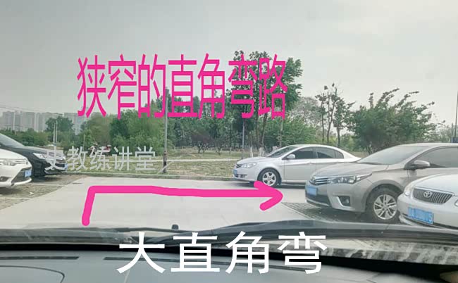比如上图中,我就是让学员提前向左侧靠拢,并且把车摆直,这样就远离了直角弯路的内角,给后轮转弯时,预留出足够的半径范围。