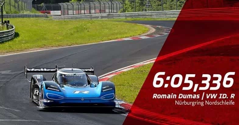最快电动车又是一台大众集团旗下的产品,车型为大众ID.R,单圈成绩为6:05.336,打破了之前由蔚来 EP9创造的6:45.90的赛道记录。