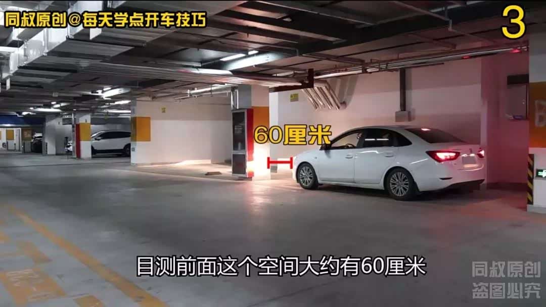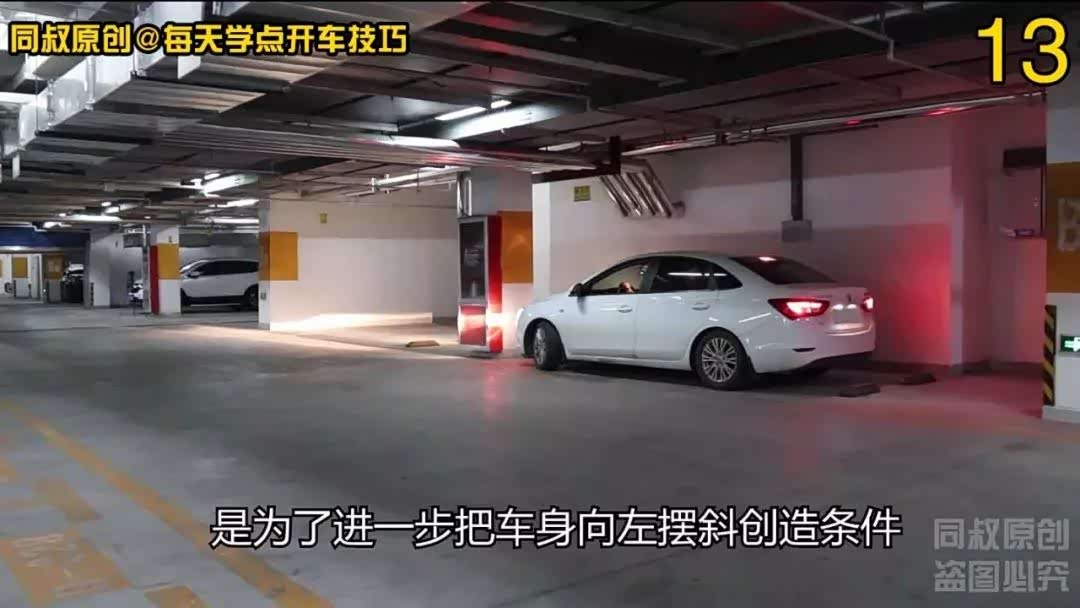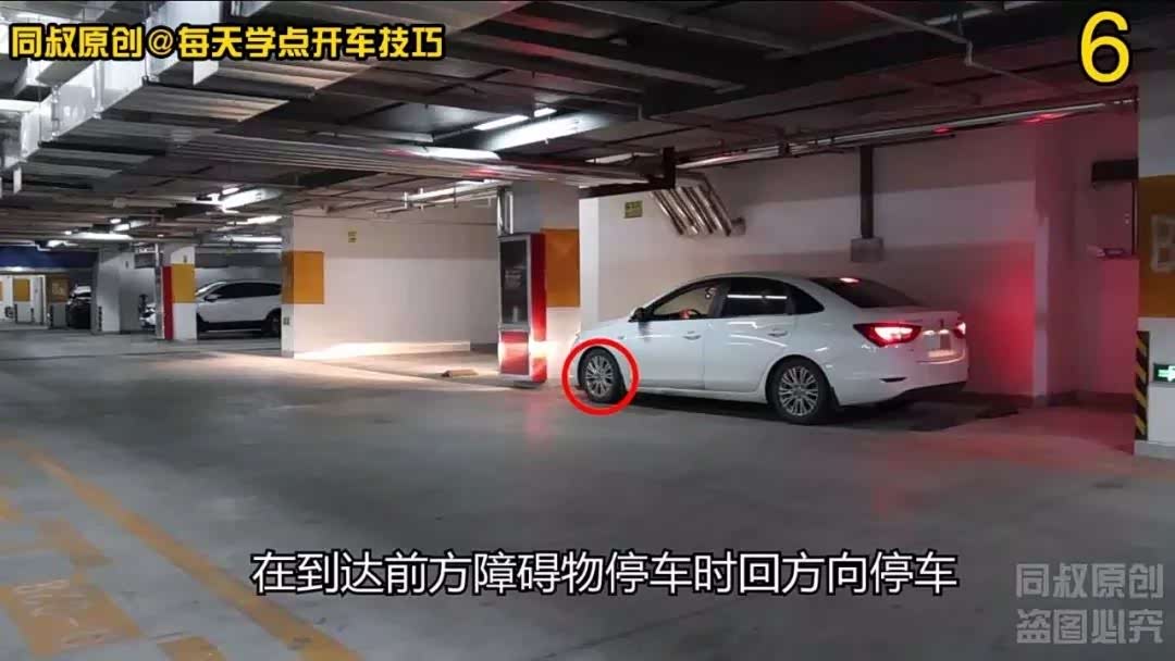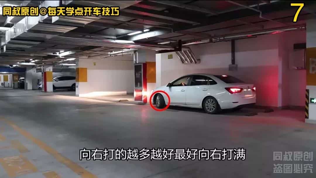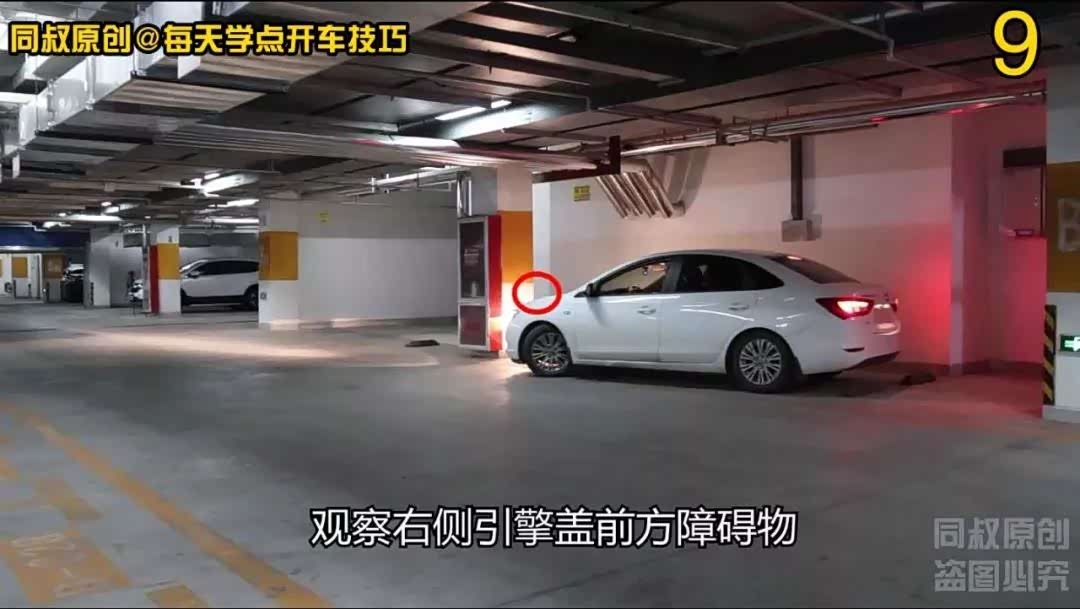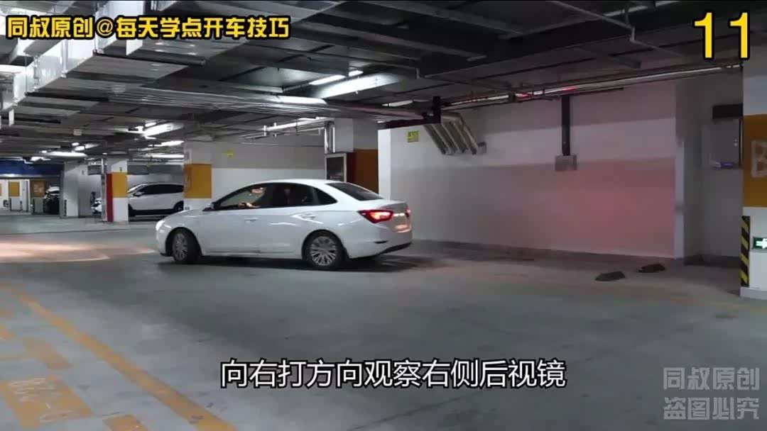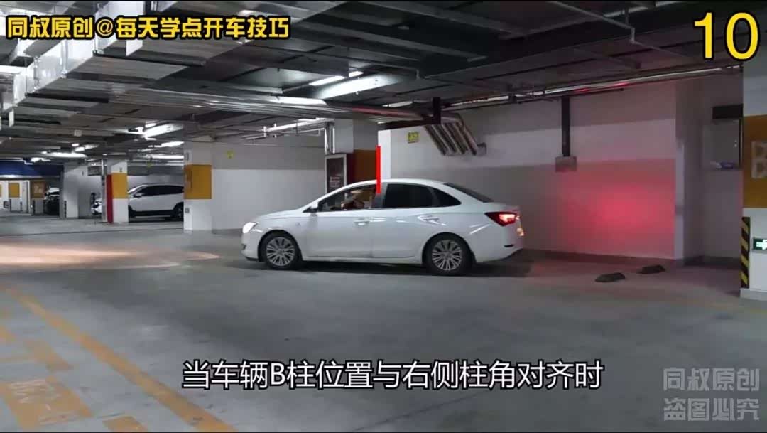 当车辆B柱位置与右侧柱角对齐时,向右打方向观察右侧后视镜确保右侧车身蹭不到柱子,把车开走。