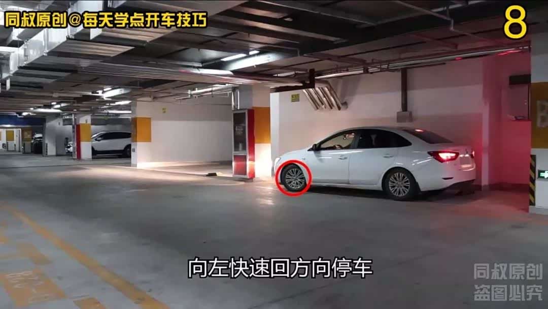 挂倒挡在向右打满方向状态下倒车,在后轮即将接近到后面车轮挡的时候向左快速回方向停车,