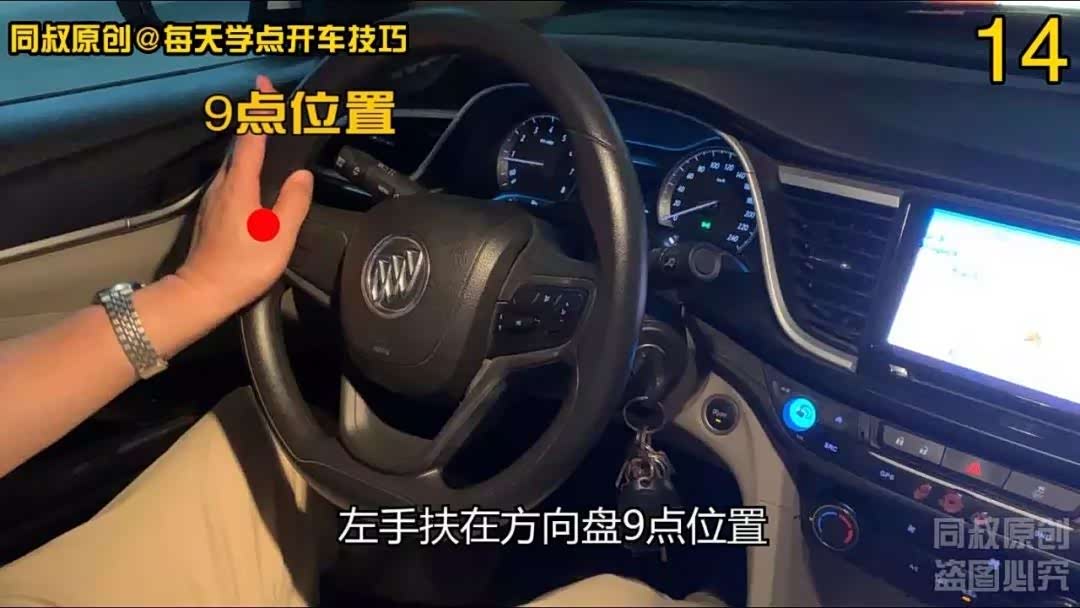 左手扶在方向盘9点位置,掌心向下压住方向盘向下向左转动,