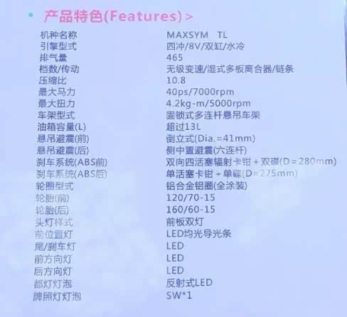 从官方公布的数据来看,这款车搭配的是一个实际排量为465CC双缸水冷四冲程发动机,而最大马力为40PS/7000rpm,最大扭力为4.2kg/5000rpm。由于没有试驾,所以具体的性能表现暂且未知。