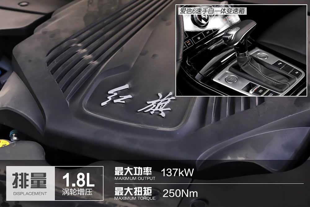 动力方面,红旗H5搭载了一台1.8T涡轮增压发动机,其最大功率为131kW,峰值扭矩250N·m,与之匹配的是来自爱信的6AT变速箱。