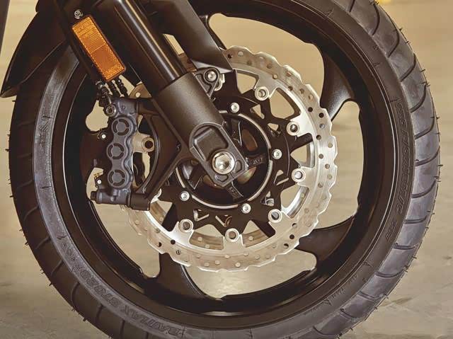 在整车的配置方面,雅马哈VMAX的制动使用了Brembo的的制动套件,320mm的前双盘搭配的是径向安装的6活塞卡钳。而后刹则是298mm刹盘配单活塞卡钳。前后带ABS且是弯道ABS,配置上雅马哈强调了自己的态度,那就是强化前刹的制动效能。
