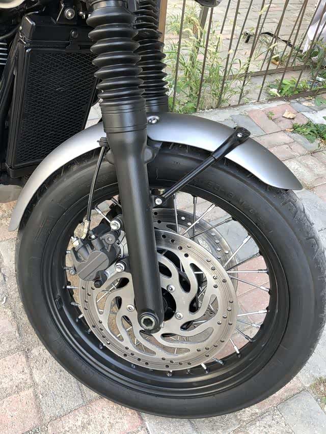 前轮为对向双活塞日清卡钳搭配310mm碟盘,为双碟盘配置,搭配不可调KYB 41毫米减震,行程120毫米,事实上刹车效果还是可以的,点头效果也还行,毕竟只是复古街车,各位骑手还是安全为好,低速驾驶。