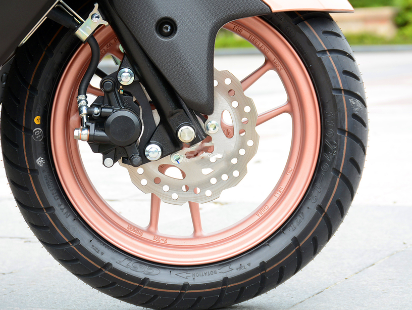 车子轮胎品牌为正新CST轮胎,前、后轮圈均为12寸,轮胎也同为110/70 R12规格。前刹车采用浪花碟盘,后刹车为传统的鼓刹,对于这款仅为99kg的车子来说足够使用。穿街走巷是巡鹰的特点,因此操控性灵活性自不用多说。