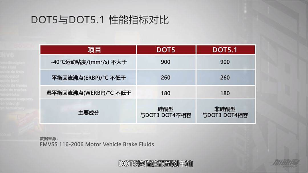 可能有朋友发现了,刹车油有DOT3,有DOT4,那是不是有DOT5呢?其实DOT5也是有的。它对性能的要求和DOT5.1完全相同,但是主要成分却不同。DOT5特指硅酮型刹车油,它与DOT3 DOT4 DOT5.1的刹车油都不相容,不能混合使用。DOT5刹车油目前在民用车上已经很少能看到了,我们这里就不多做介绍了。