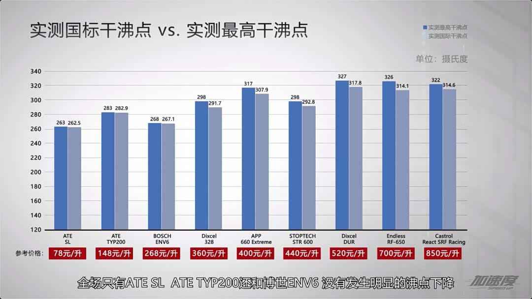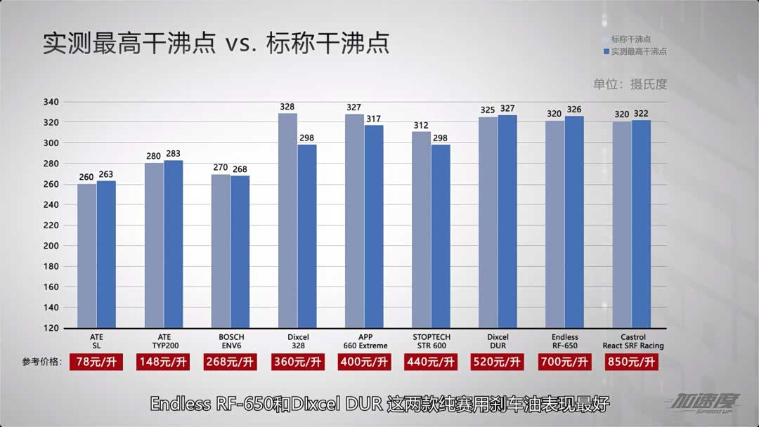 Endless的RF-650和Dixcel DUR这两款纯赛用刹车油的表现最好,最高沸点都超过325度。嘉实多的SRF做为改装圈里的神话,实测沸点为322度。