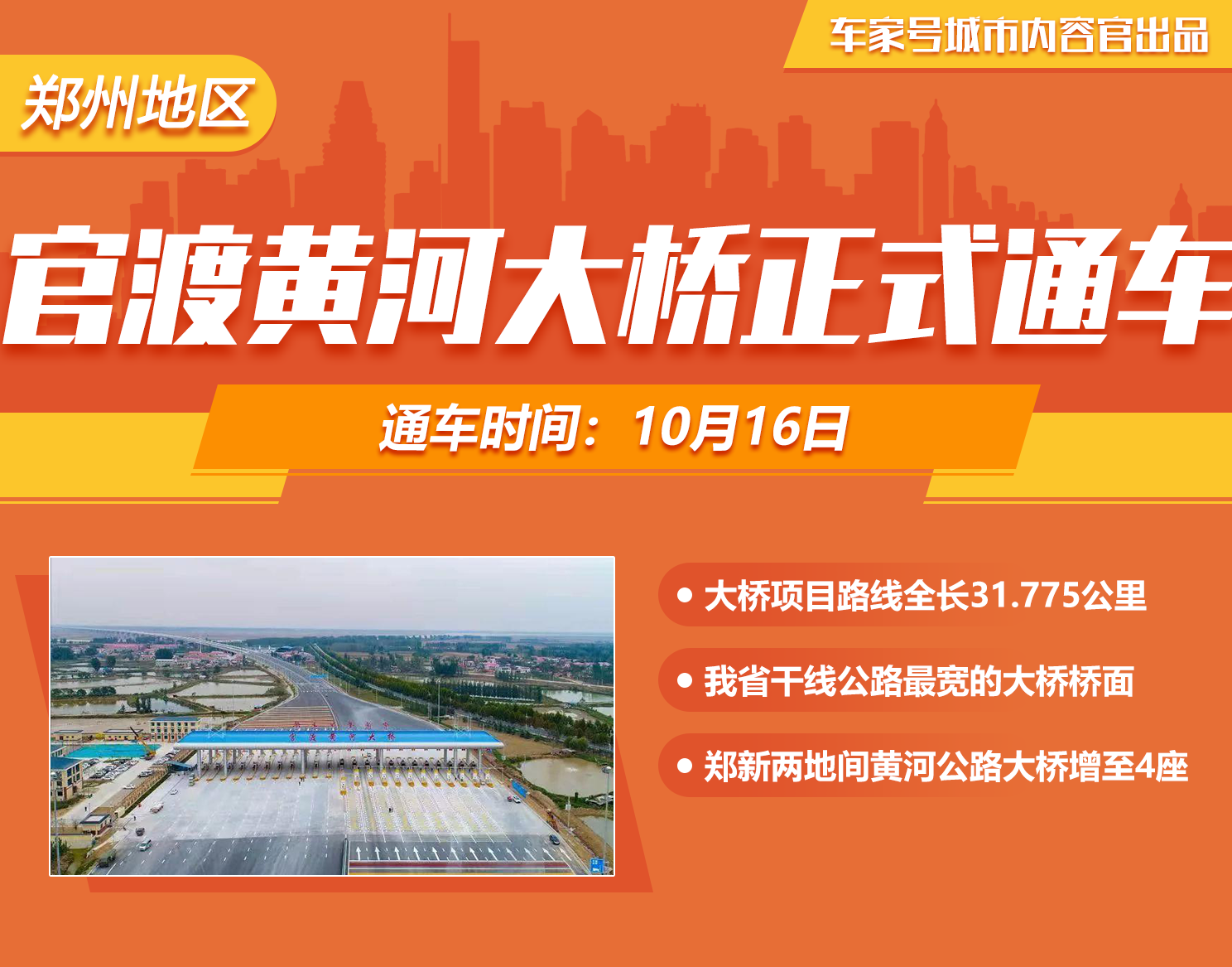 10月16日上午10时许,国道107官渡黄河大桥正式通车,至此,郑新两地间黄河公路大桥增至4座。