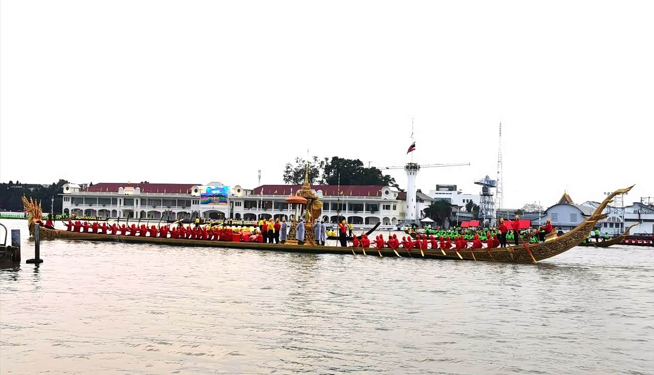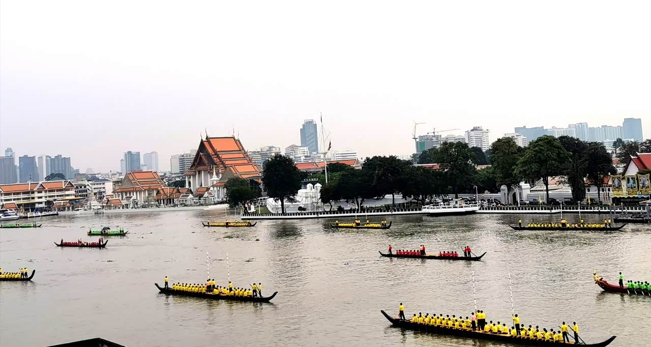 办好入住后开车前往湄南河边的郑王庙和黎明寺,也就是在大皇宫那一代,跟着导航走,大概半个小时就到了。恰好碰上了泰国十世王加冕水上大巡游船队演练,整条湄南河上共有52艘船将近2200人组成的船队,河岸两边戒备森严,有无数的警察和便衣在维护,虽然有点感到害怕,但又觉得很庆幸能观赏到如此壮大的场面。