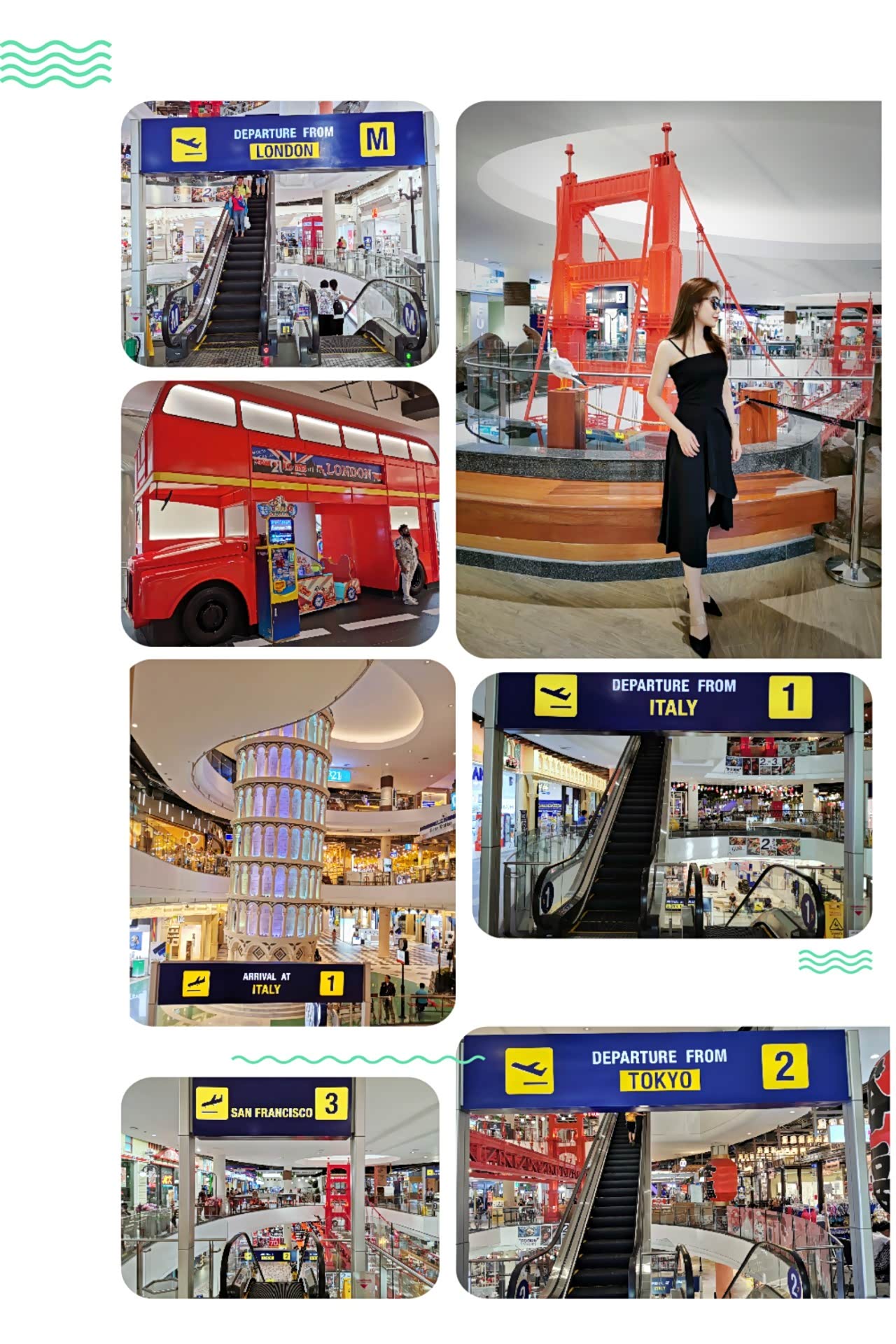 Terminal21特别之处是整个商场设计成机场航站楼,并且每一层都是不同国家城市的特色,有巴黎、伦敦、意大利、旧金山、东京、好莱坞,每层的装修风格都有着强烈的当地街头风格,甚至厕所也按照这个城市的风格来设计。