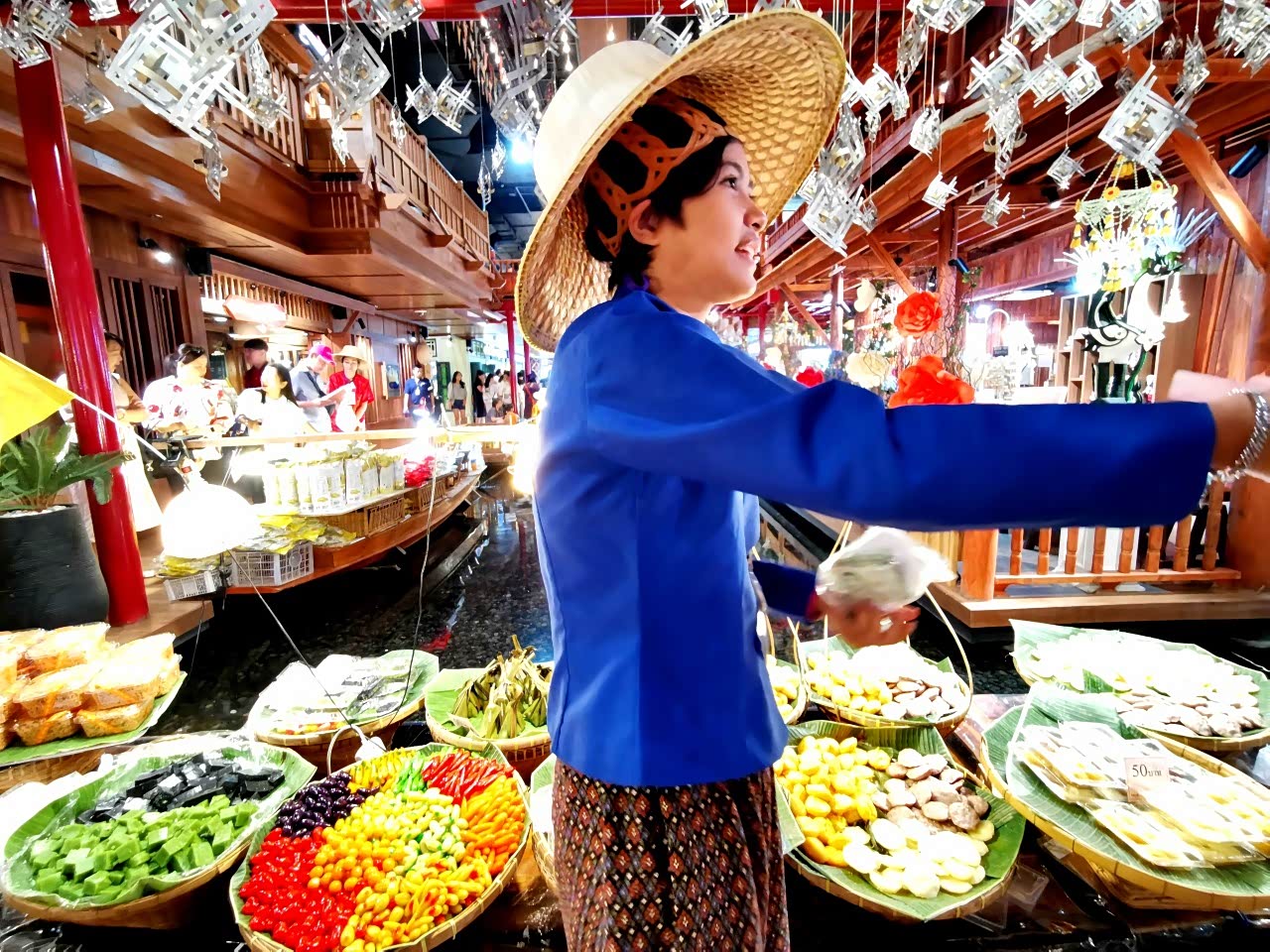 安葩洼水上市场就是坐着小船游览河道两边的风景,一路会有不同的摊子在卖东西,买的也都是一些水果、芒果糯米饭之类的小食物。