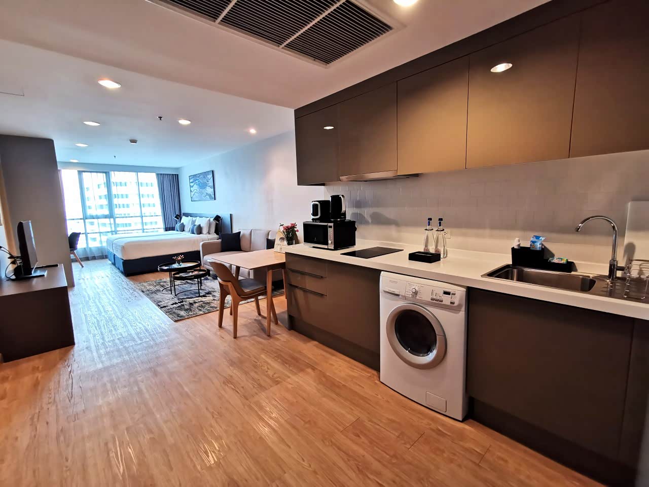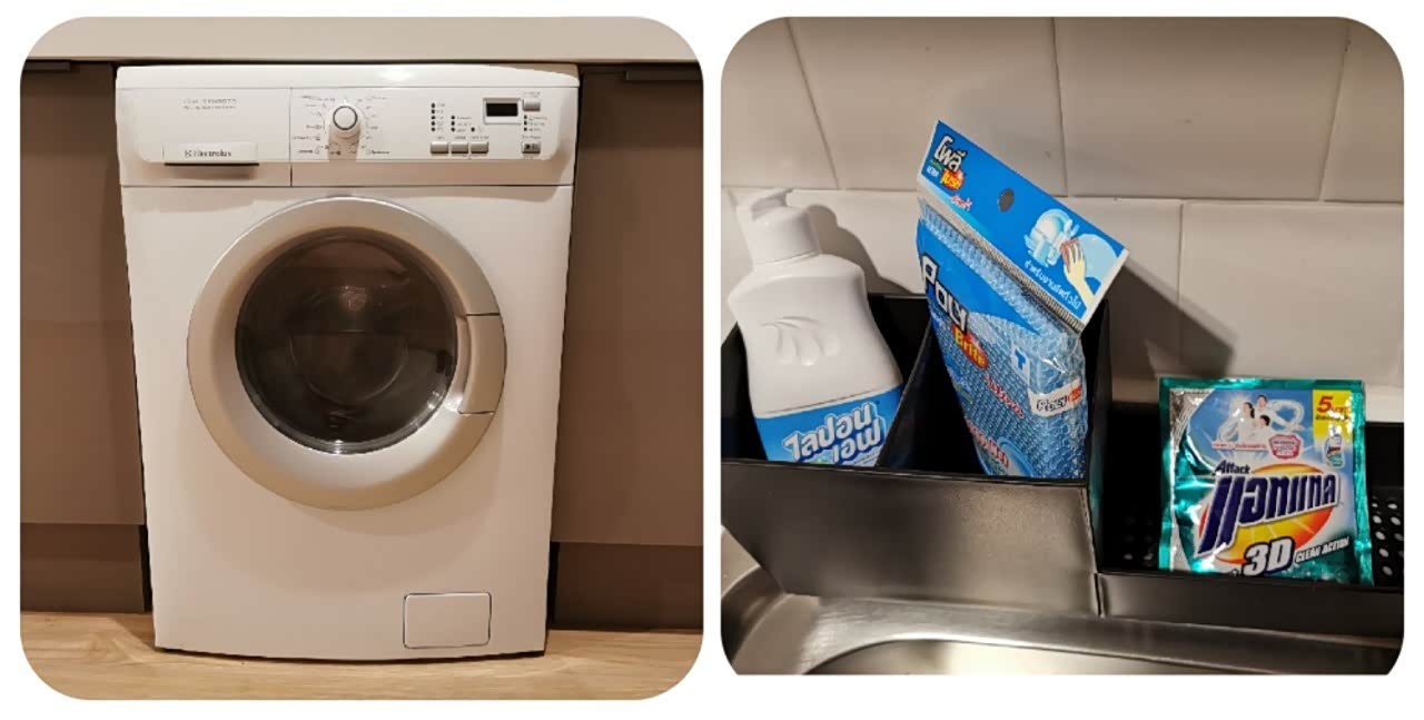 到达预定的酒店公寓办好入住,因为在芭提雅住的是海景房酒店,所以在曼谷就想体验不一样的酒店式公寓。入住了位于曼谷市中心的莎玛阿索湖服务式公寓,这里的房间都很大,厨具非常地丰富,可以在房间里做饭聚会。最最最棒的就是这台带烘干功能的洗衣机,旅行时能有洗衣机帮你洗衣服,也太爽了吧!淡季的价格一间房也就三四百人民币!