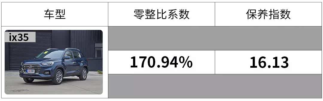 现代ix35的零整比系数仅为170.94%,这个成绩在这么多车型中可以排进前十。配件的价格低意味着在维修的时候花费就少了,而它的保养指数为16.13(买菜车一般集中在8-20之间),也处于一个正常的水平。