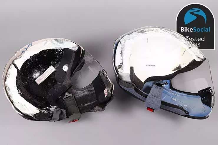 切开之后,我们可以的看到,Arai的外壳是由复合纤维和树脂制成,而普通的头盔外壳使用了一种生产成本更低的热塑材质,两者都符合欧盟的ECE 22.05安全标准。