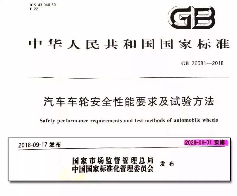首先我们回溯到2018年9月17号,当时国家发布了GB36581《汽车车轮安全性能要求和试验方法》。而在前不久,有关文件显示:该标准将于2020年1月1日正式成为国家强制标准。同时该标准将与GB 9743-2015《轿车轮胎》、GB/T 26278-2017《轮胎规格替换指南》一起成为轮毂和轮胎的强制性国家标准。
