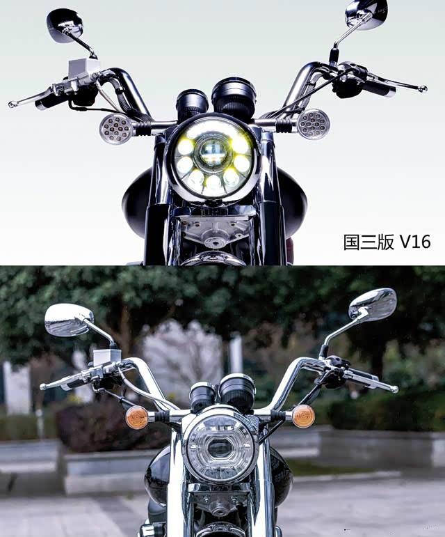 其二:灯光方面。力帆V16大灯得到全面改进,国三版V16采用美式巡航的设计,不过大灯亮度表现一般。而国四版本是在国三的基础上,前脸大灯采用升级版LED灯组,并且对大灯灯光内部进行了重新设计,灯组排列也做了改进,亮度表现和辨识度都有很大提升。从正面来看,外形也更为美观大方,颜值更高。