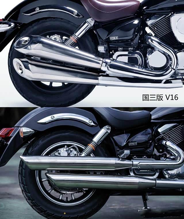 其一:力帆V16消声器的改进。其实力帆V16国三版的排气筒被国内不少车友吐槽,很多摩友说国三版V16排气看起来像香肠嘴弯曲造型,看上去比较丑,也不符合太子车的定位。而的国四版力帆V16对消声器做了改进,采用了十分经典的外形,回归最原始的直筒设计,复古气息大大提升,质感也得到了加强。